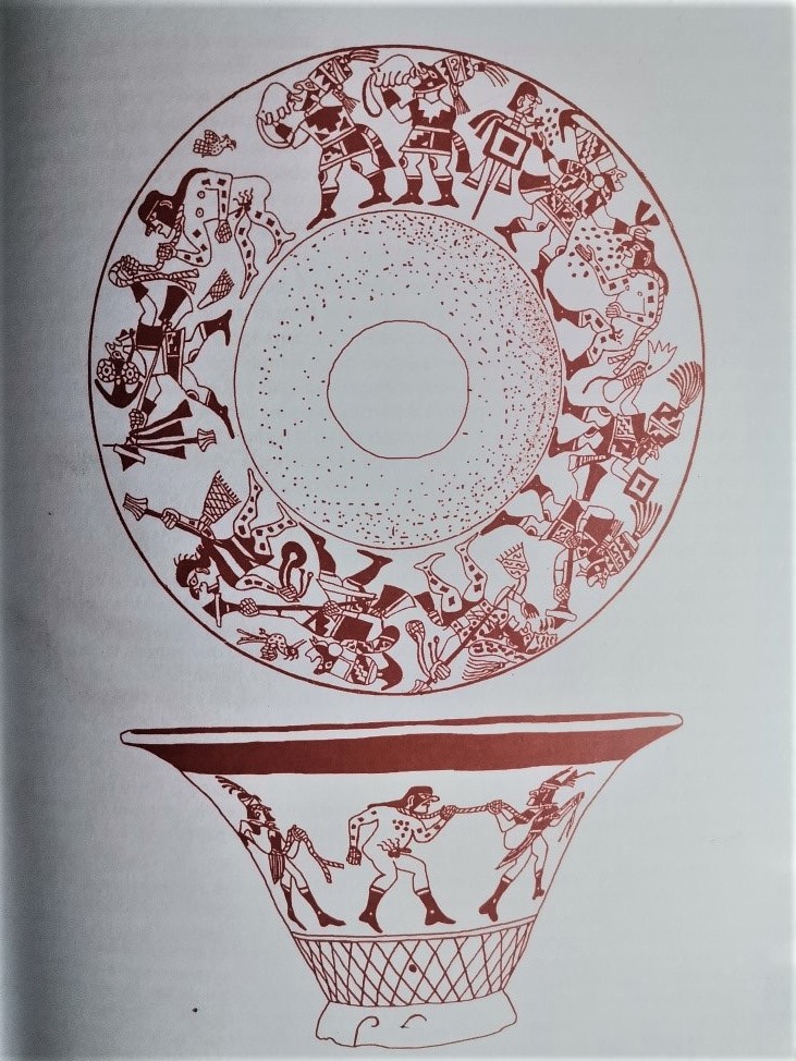 No se trata, según Golte, de diseños instalados en el ceramio con fines solamente decorativos, realidad que, hay que subrayarlo, no es propia de ninguna cultura en el horizonte civilizatorio andino. Se describe el ceramio señalando que se trata de una fuente acampanada que muestra en su parte inferior pirámides del mundo de abajo. Golten llama pirámides a la malla. [4]