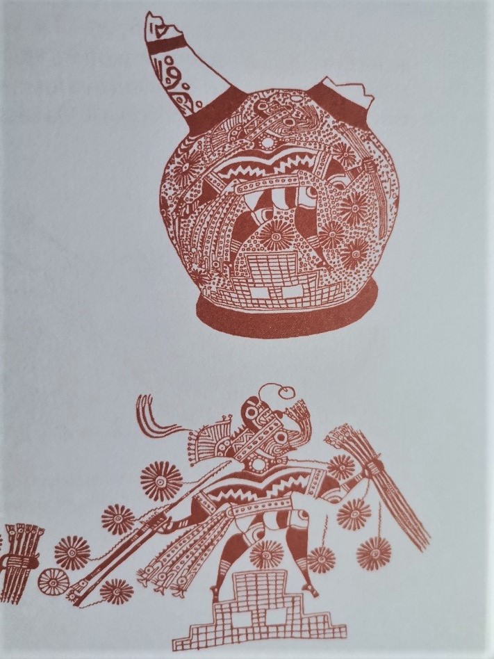 En este ceramio, donde la malla está asociada a la Chacana, nada menos, la descripción señala que se trata del ayudante iguana que está lanzando flores al aire. Refiere Golte que el tinku básico del ritual es entre el mundo de abajo y las flores arrojadas al de arriba. [5] Vemos la asociación que hace entre el mundo de la chacana con mallas como sitio del Uku pacha.