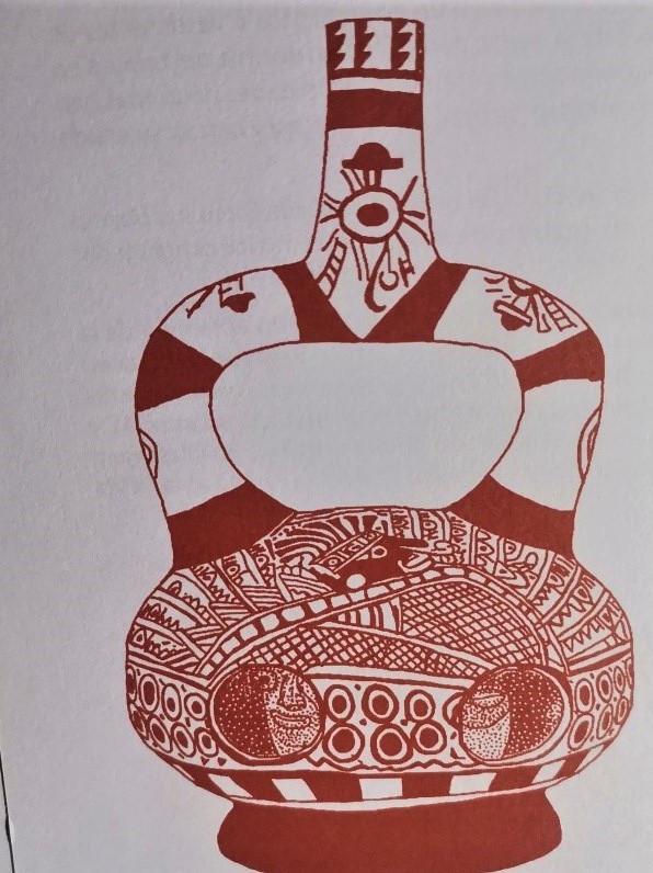 En este último ceramio, Golten describe cautivos en el bote de la diosa lunar en el interior de la vasija, es decir ya habiendo pasado el umbral de la muerte. De nuevo el Uku pacha. [6] En este ceramio la malla ocupa el centro del ceramio, el corazón, en otros términos, el punto nodal de las concepciones acerca de la muerte. Lo subrayo por la comparación que tendrá luego este punto con la figura colonial que se mostrará.