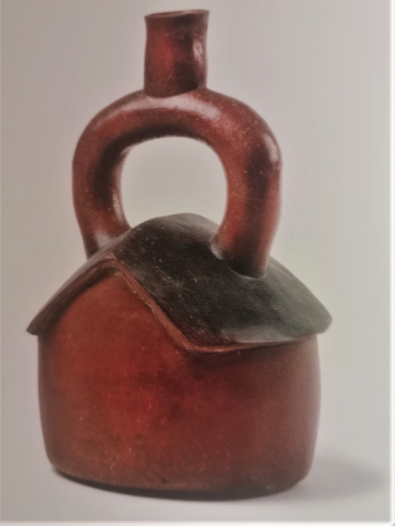 Dibujar un perímetro en forma de casa de dos aguas es el modo más claro de interpretar el universo como vivienda de toda la humanidad; se trata de un gran templo que es, al mismo tiempo, hogar, casa familiar, como las paredes que albergan a cualquier sencillo poblador andino. Pregunta pertinente: ¿Viendo la imagen moche: ¿dónde se aplica el criterio de altar cristiano y barroco? Para añadir pruebas de los errores de los críticos, resulta conveniente revisar un texto de Adine Gavazzi para acercarnos, por medio del testimonio gráfico que brinda, a una comprensión más amplia del techo a dos aguas como elemento representativo de la unión de lo divino y lo profano en la civilización andina. [3]