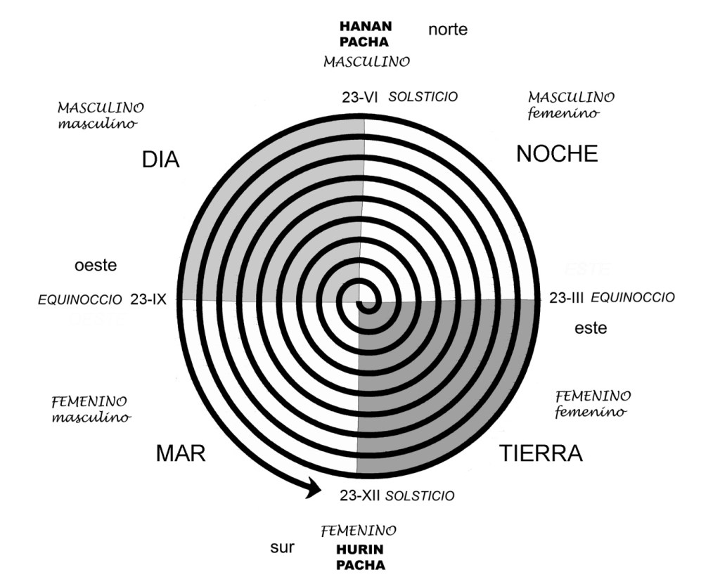 Otra consideración que abona en favor de esta lectura: la forma que posee el tiempo cíclico andino. No es el tiempo del eterno retorno europeo. Jurgen Golten lo describe y dibuja según observamos en la figura siguiente. [7] El tiempo andino es cíclico, sí, pero no conserva la repetición mecánica de los acontecimientos; los Pachacutic renuevan los procesos sociales aproximándose a los tiempos anteriores, sin imitarlos ni copiarlos con exactitud. Todos los tiempos son semejantes, pero distintos. Es un tejido complejo en el que espacio y tiempo se entrecruzan edificando una urdimbre, malla y red compleja.