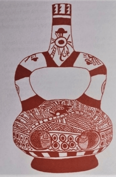 No son diseños instalados en el ceramio con fines solamente decorativos, realidad que no es propia de ninguna cultura en el espacio civilizatorio andino. El primer ceramio es descrito como una fuente acampanada que muestra en su parte inferior pirámides del mundo de abajo. Golte llama pirámides a la malla. [1] En el siguiente, la malla está asociada a la Chacana y la descripción señala que se trata del ayudante iguana que está lanzando flores al aire. Refiere Golte que el tinku básico del ritual es entre el mundo de abajo y las flores arrojadas al de arriba. [2] Subrayamos la asociación que hace entre el mundo de la chacana con mallas como sitio del Uku pacha. En el último ceramio Golte describe cautivos transportados ya se encuentran en el interior del cuerpo de la vasija, es decir ya pertenecen al mundo de abajo, como también lo indicarían sus caras pintadas de rojo. [3] De nuevo el Uku pacha. En este ceramio la malla ocupa el centro del objeto, el corazón, en otros términos, el punto nodal de las concepciones acerca de la muerte. Lo subrayo por la reiteración de este concepto en la pintura colonial que se mostrará.