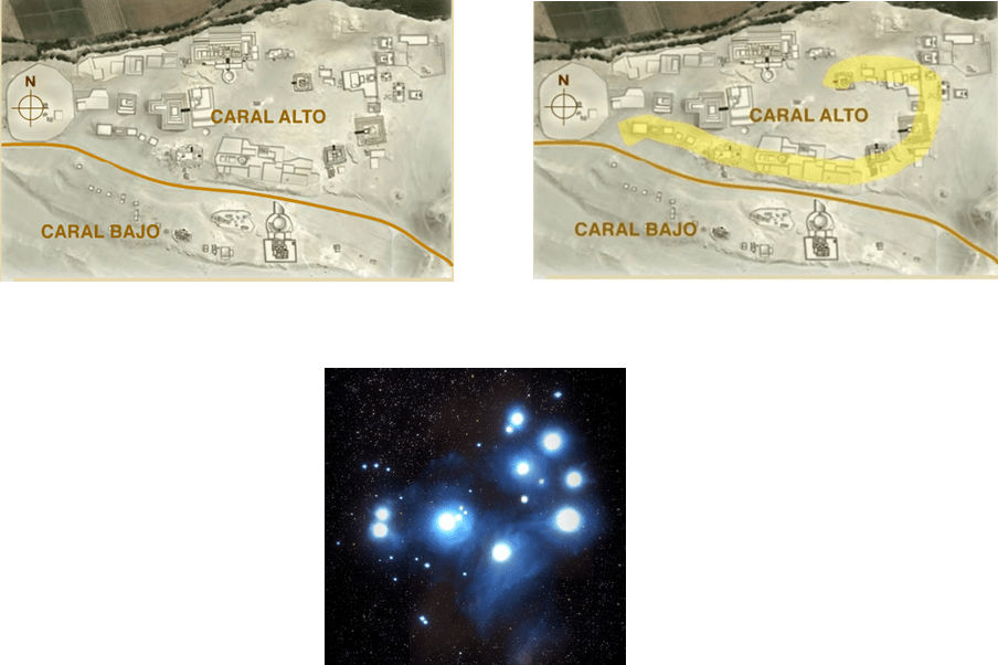 | Traza urbana con la forma de la Qollca y también resaltada y resaltada en amarillo. Perfil de la constelación en posición similar a la hallada en la ciudadela de Caral. |