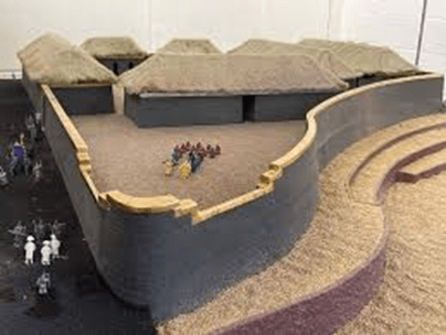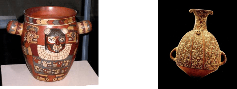 | Ceramio calendario Huari con silueta de la Qollca en la parte superior izquierda alrededor del ojo del Amauta, y Arìbalo del período Inca con sus perfiles emulando la silueta de la Qollca. |
