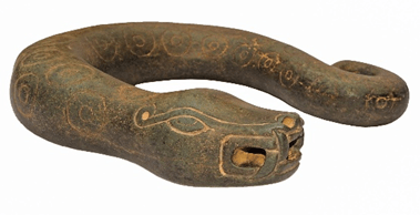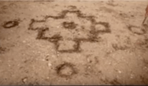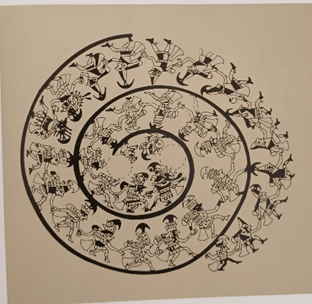 Veamos en Montegrande, cultura Marañón de cinco mil años o más de antigüedad. En la sierpe vemos dibujado el círculo con características muy semejantes a otras expresiones posteriores. El doble círculo se repite en Chavín. En la cabeza de la figura se observa también una versión de la lemniscata, también símbolo del espacio-tiempo. El centro ceremonial, que hemos analizado en entrega anterior, muestra un desarrollo en espiral que nace en un círculo que, por el desarrollo mismo de la figura no es un círculo terminado, sino también espiralado. Postulo que este punto origen es una manera distinta de concebir el circulo que aparece concluido en la sierpe.