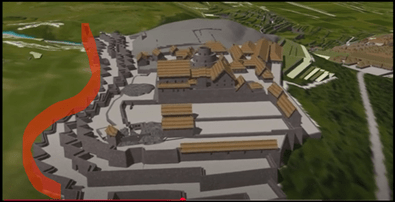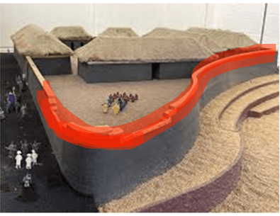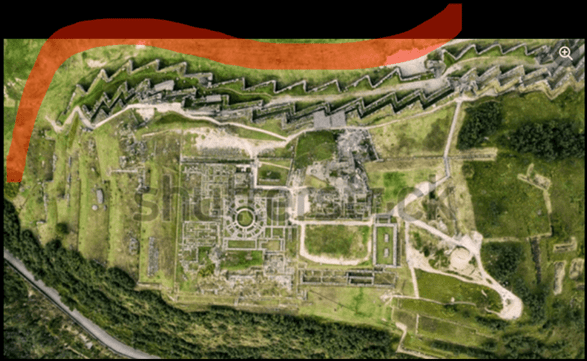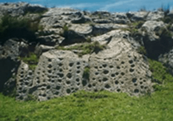 En Chankillo vemos dos círculos en sugerente ubicación, como parte de un observatorio astronómico. Pertenece a la cultura Sechin, muy cercana a Caral en el tiempo y espacio y también a Chavín si tomamos en cuenta el tiempo largo de su vigencia. Llama la atención que ambos círculos tengan características muy parecidas al circulo que mostramos más delante de la chakana del Lanzón de Chavín: dos círculos concéntricos y protuberancias en sus centros.